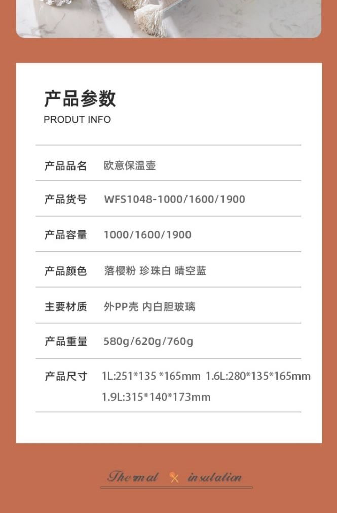 颜色:落樱粉 珍珠白 清空蓝 尺寸:140*173mm 材质:食品级PP塑料外壳 内外胆双层玻璃层真空隔热镀银层 食品用玻璃内胆,抽真空保温内胆镀银工艺,保温更强劲。 包装:单瓦盒