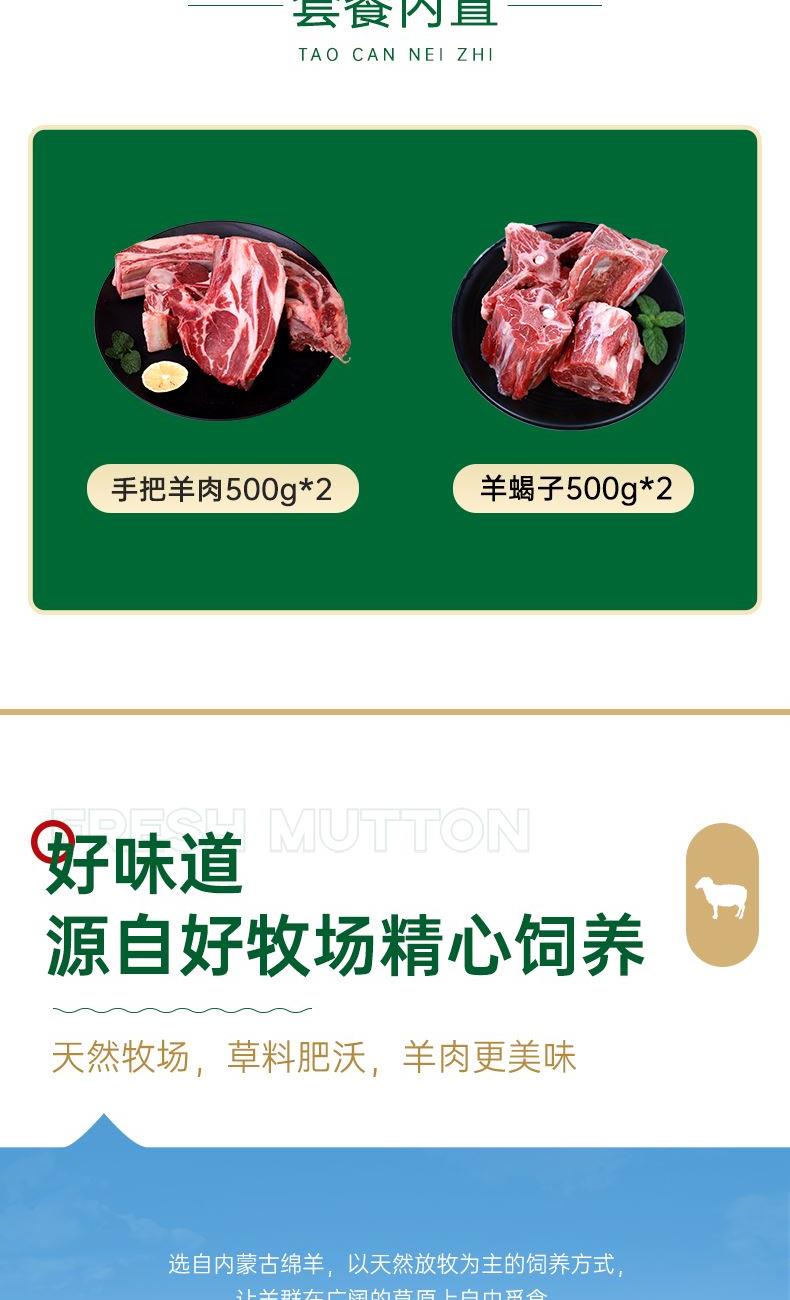 配置:内蒙草原原切手把羊肉500g*2 内蒙草原原切羊蝎子500g*2 卖点:1.礼盒包含了肉、骨,在家也能做出满满的美味佳肴。 2.原切肉不添加任何添加剂,食用更放心! 3.礼盒精美承载心意与祝福!