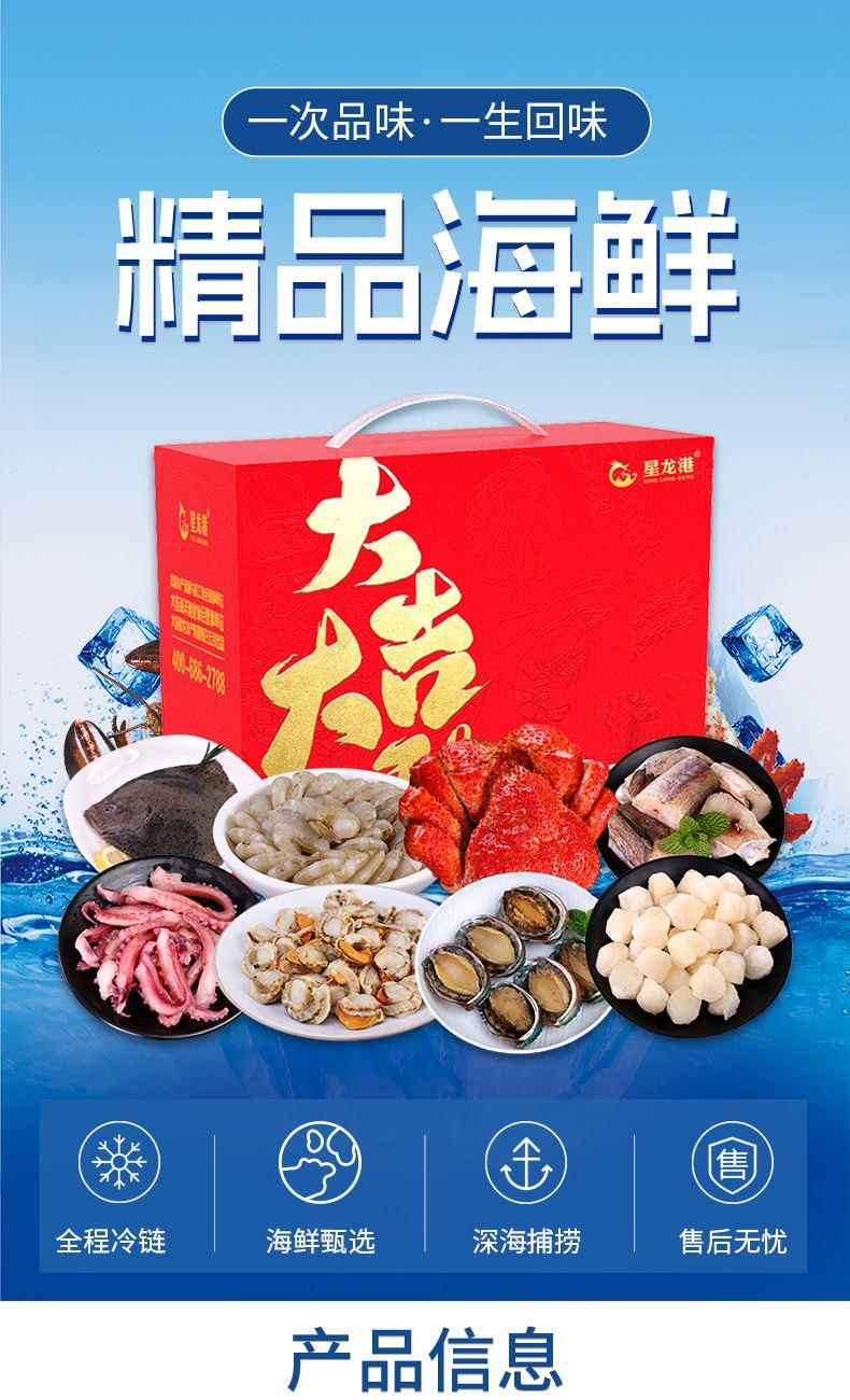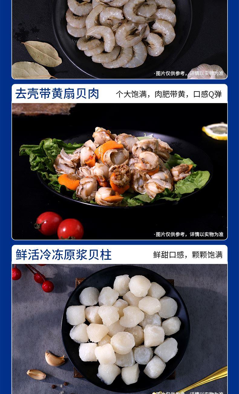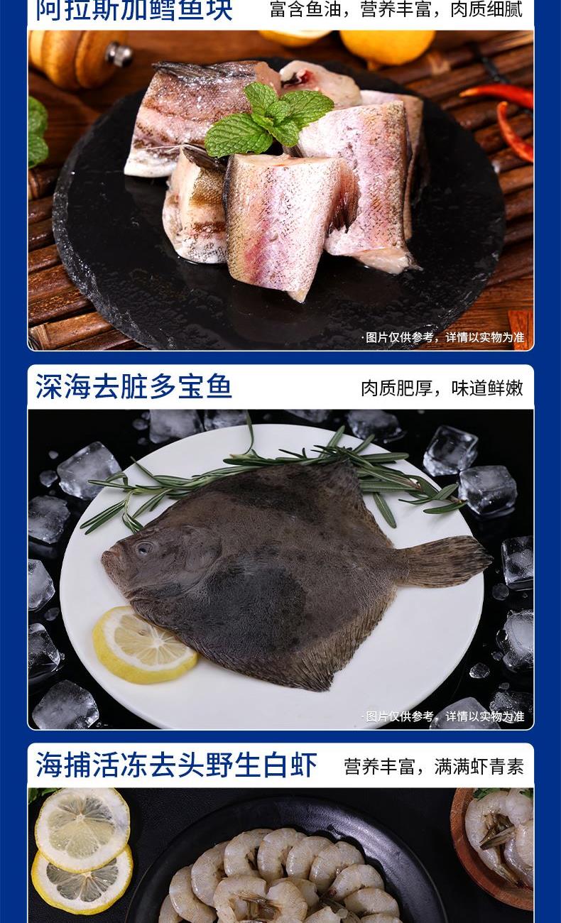 阿拉斯加熟冻鳕蟹300g-400g 海捕活冻半壳鲍鱼400g 阿拉斯加鳕鱼块300g 鲜冻深海去脏多宝鱼250g-300g 海捕活冻去头野生白虾400g 冷冻去壳带黄扇贝肉300g 鲜活冷冻原浆贝柱300g 鲜活冷冻鱿鱼须300g