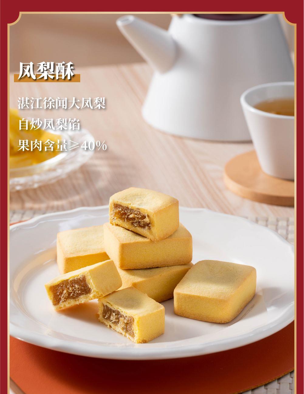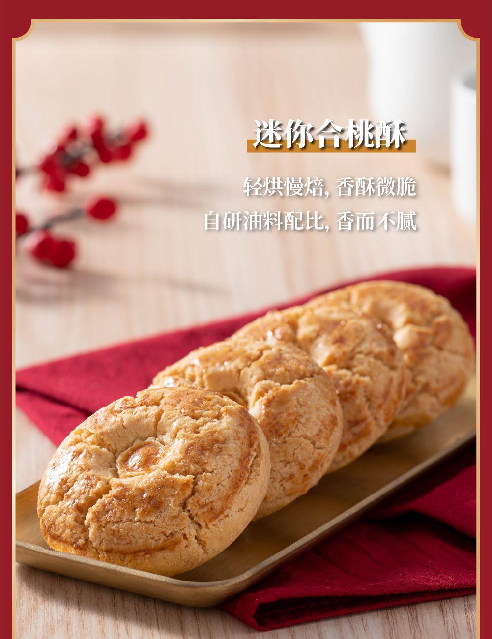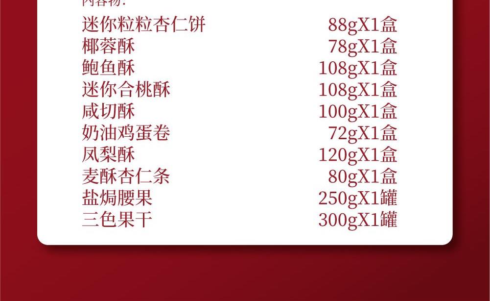 十月初五十方聚臻礼盒 净含量:1304g 88g迷你粒粒杏仁饼X1盒 80g麦酥杏仁条X1盒 108g迷你合桃酥X1盒 72g奶油鸡蛋卷X1盒 108g鲍鱼酥X1盒 78g椰蓉酥X1盒 100g咸切酥X1盒 120g凤梨酥X1盒 250g盐焗腰果X1罐 300g三色果干X1罐