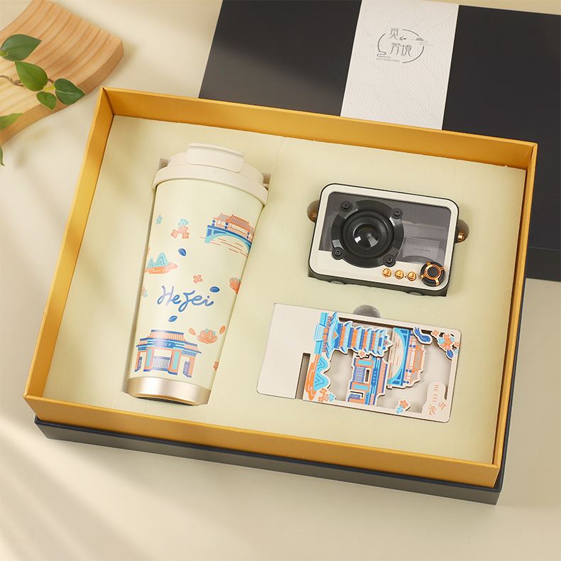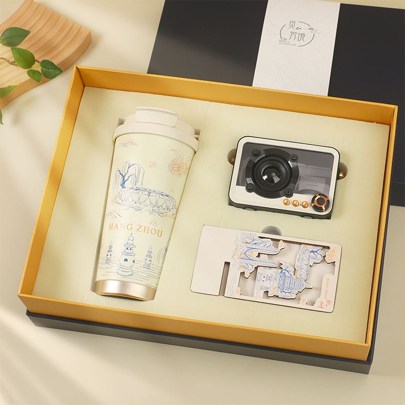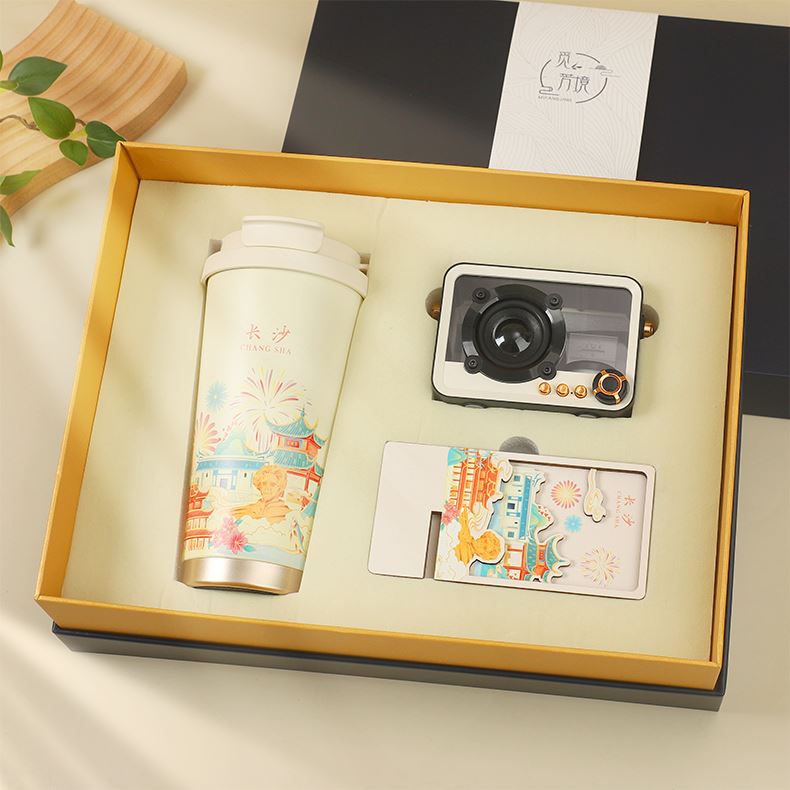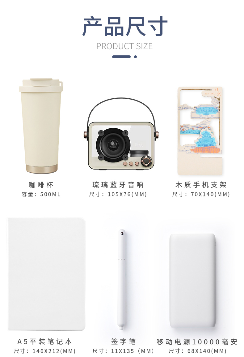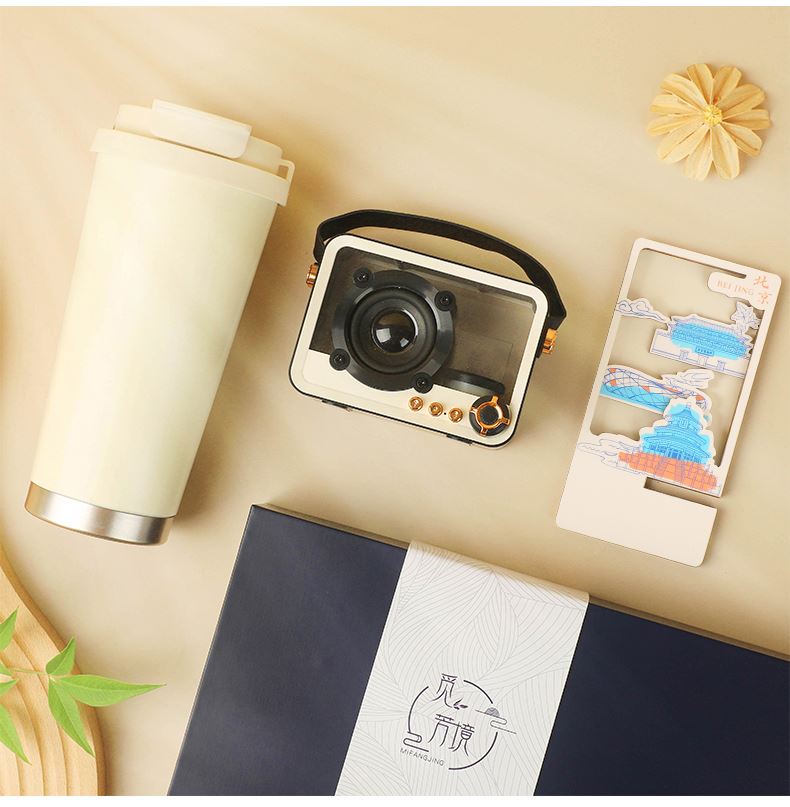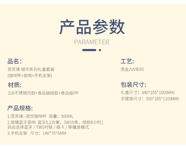 1.觅芳境--双饮咖啡杯 容量:500ml 内胆:316 外壳:304 杯盖:食品级PP 吸管:食品级硅胶 吸嘴:食品级PP 密封圈:食品级硅胶 2.琉璃蓝牙音响 蓝牙5.2方案,5W功率,续航6小时; 自由选择蓝牙 / TWS对联 / 插卡 / 等播放模式 3.手机支架 140*70*6MM 礼盒尺寸:34*25.5*10cm 手提袋尺寸:35*26.5*11cm