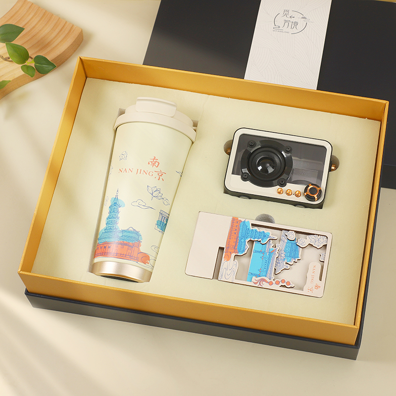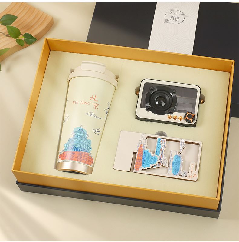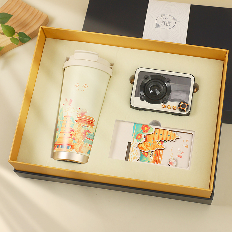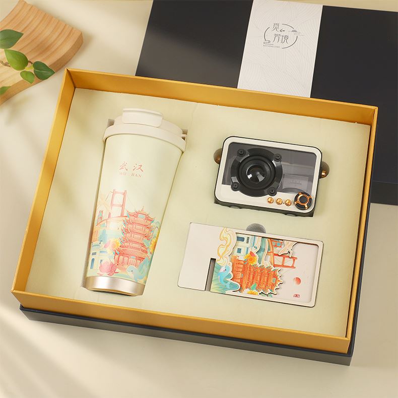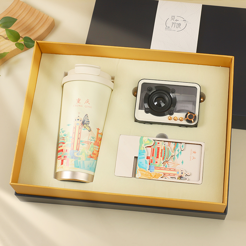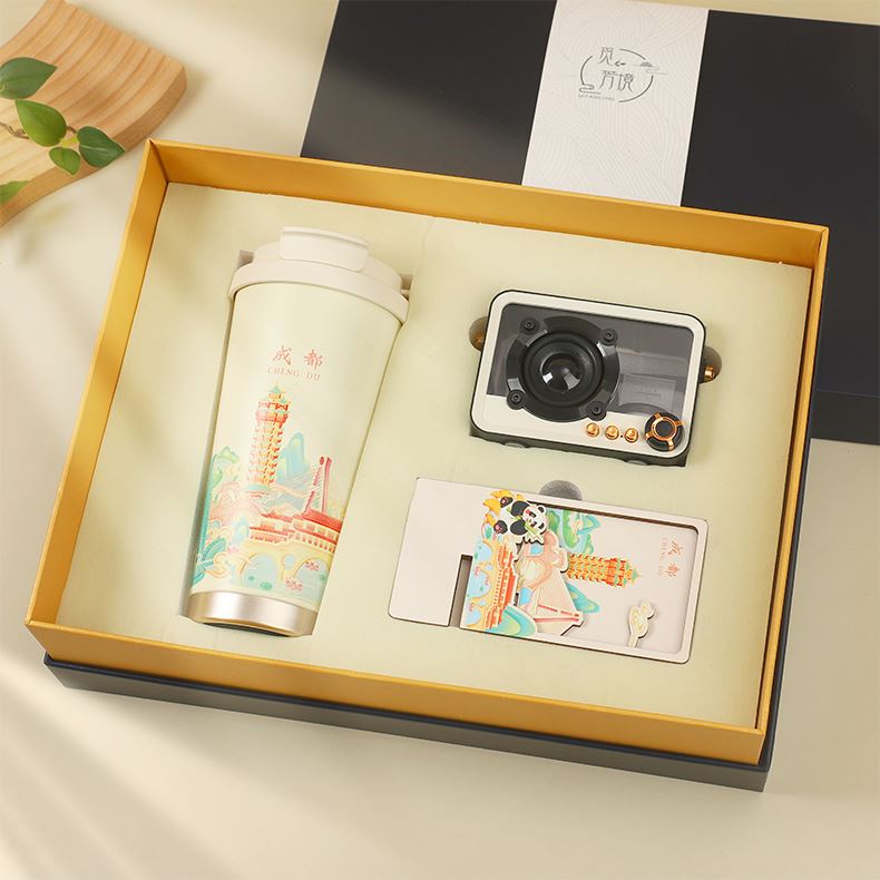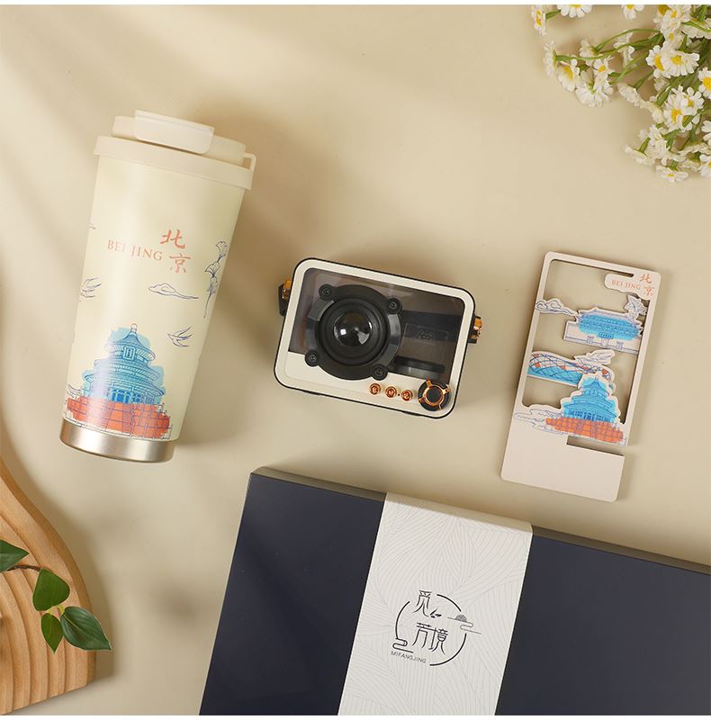 1.觅芳境--双饮咖啡杯 容量:500ml 内胆:316 外壳:304 杯盖:食品级PP 吸管:食品级硅胶 吸嘴:食品级PP 密封圈:食品级硅胶 2.琉璃蓝牙音响 蓝牙5.2方案,5W功率,续航6小时; 自由选择蓝牙 / TWS对联 / 插卡 / 等播放模式 3.手机支架 140*70*6MM 礼盒尺寸:34*25.5*10cm 手提袋尺寸:35*26.5*11cm