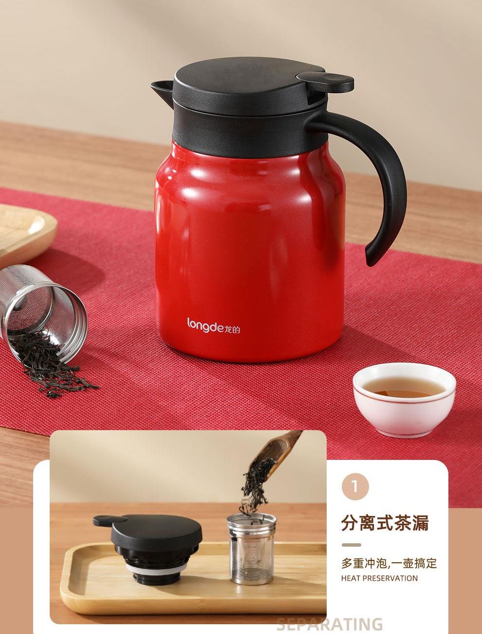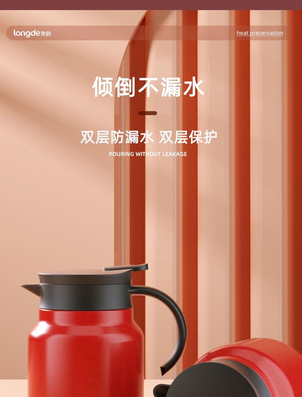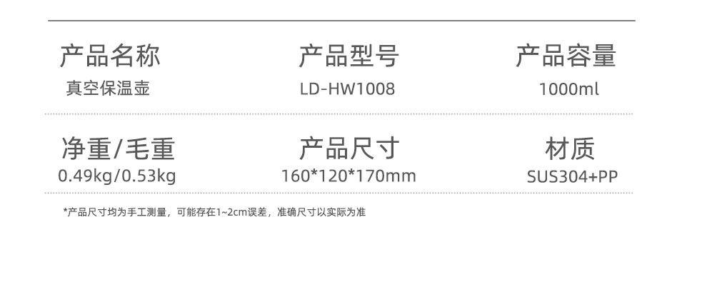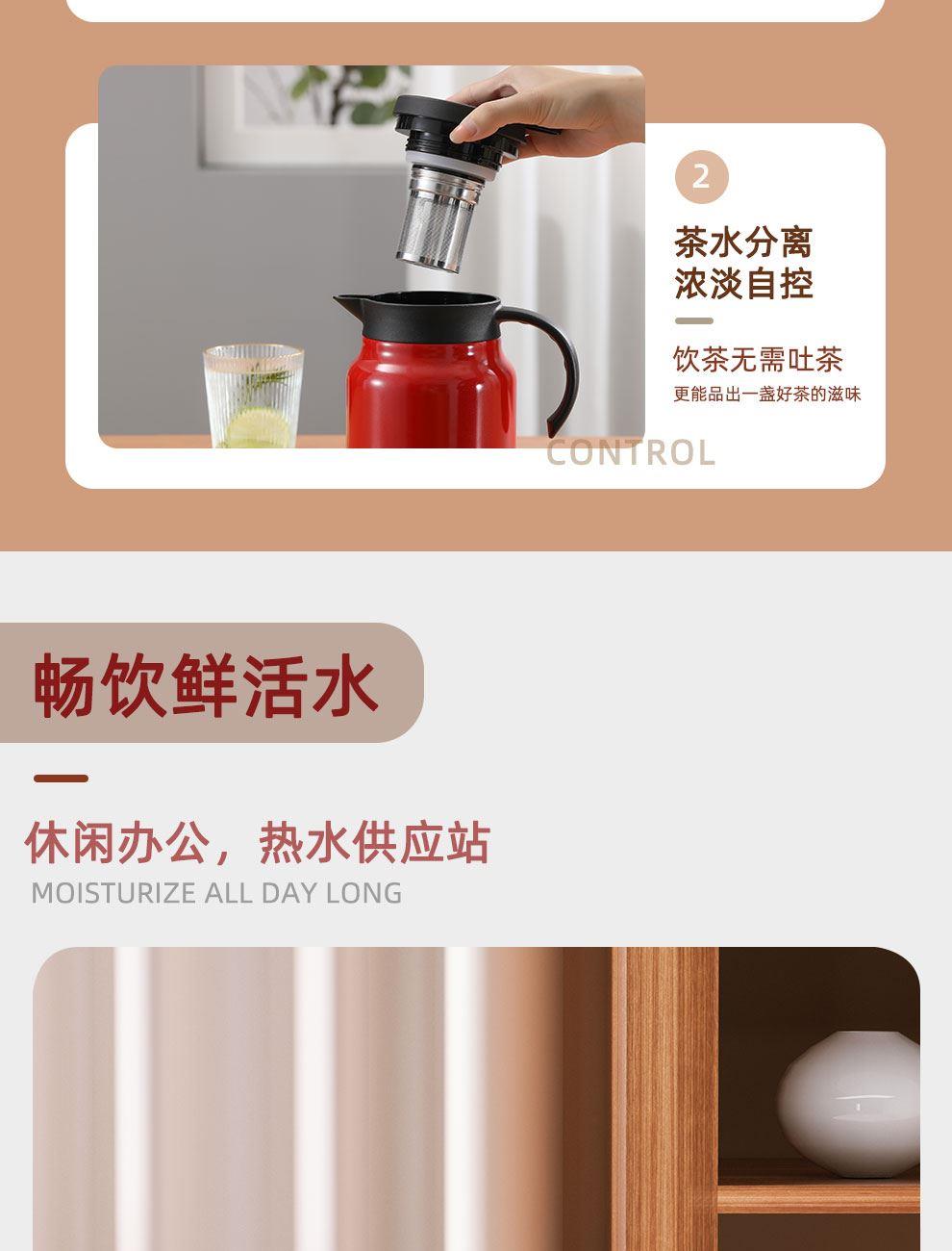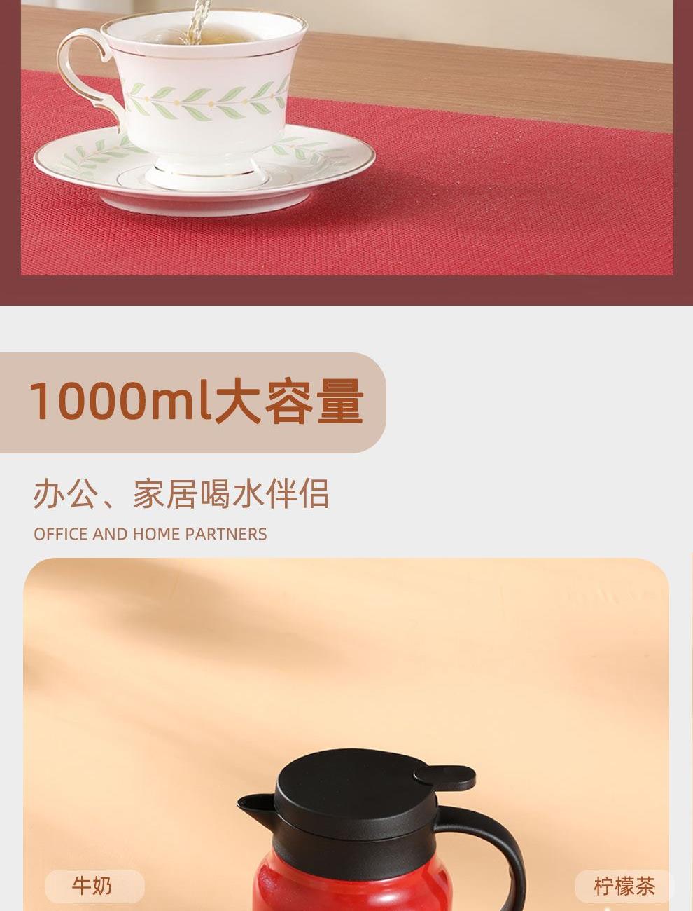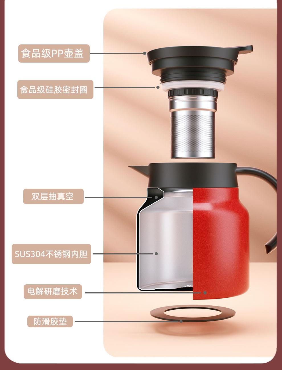 产品容量:1000mL 产品材质:SUS304+PP 产品净重:0.49kg 产品毛重:0.53kg 整箱重量:22.3kg 装 箱 数:40台/箱 SUS304壶体茶漏食品级304电解研磨内胆茶漏,红色烤漆壶身 冷热双保双层抽真空,冷热两用,长效保温 按压出水一键按压出水 硅胶密封食品级硅胶密封圈,不易漏
