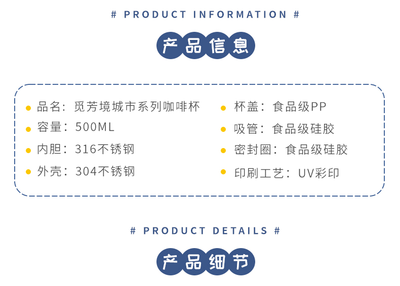 容量:500ml 内胆:316 外壳:304 杯盖:食品级PP 吸管:食品级硅胶 吸嘴:食品级PP 密封圈:食品级硅胶