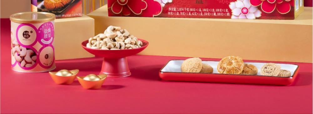 十月初五八方来财礼盒 净含量:1047g 88g迷你粒粒杏仁饼X1盒 108g鲍鱼酥X1盒 108g迷你合桃酥X1盒 80g奶油麦酥条X1盒 78g椰蓉酥X1盒 62g奶油小蛋卷X1盒 250g盐焗腰果X1罐 300g三色果干X1罐