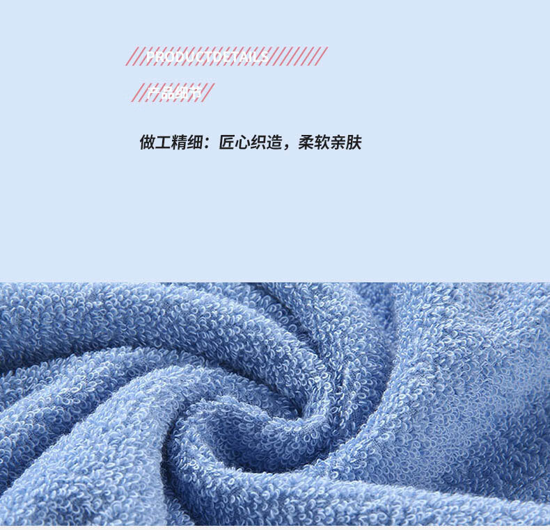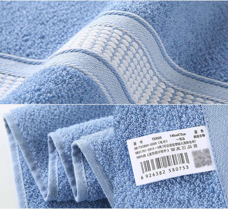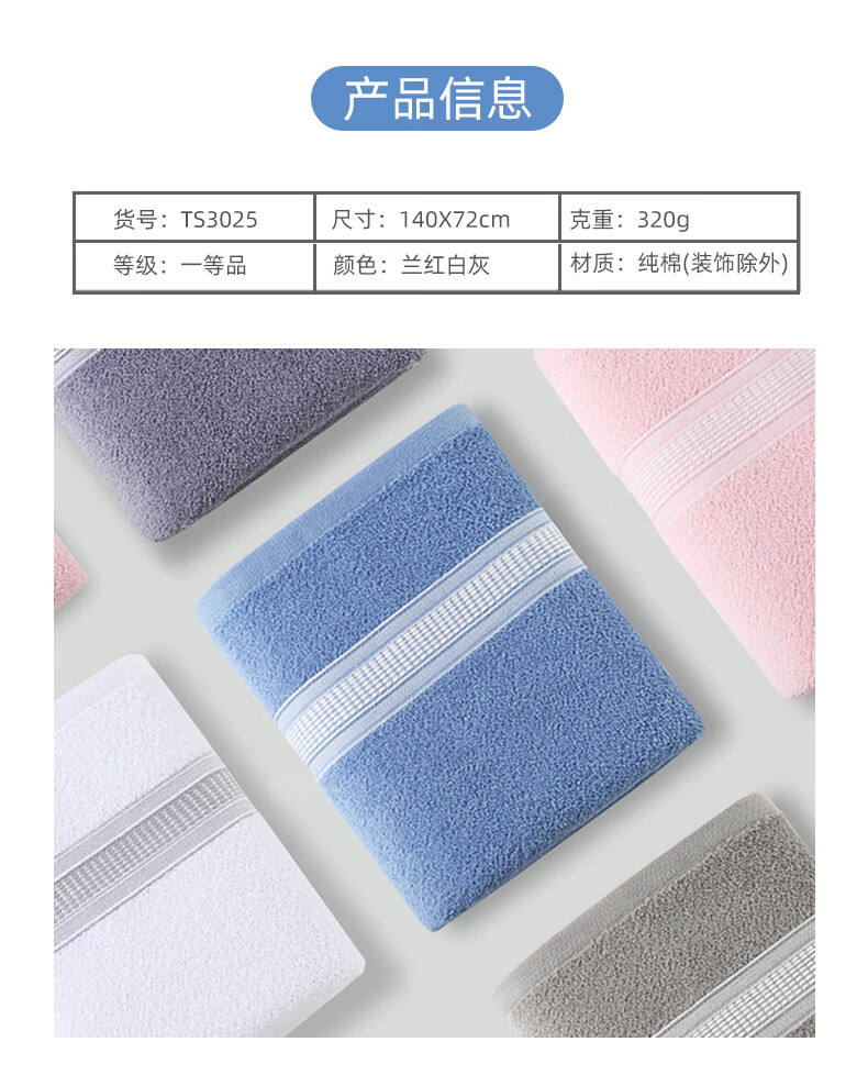材质:纯棉 货号:TS3025颜色:蓝 灰 红 产品说明: 1.用心选好棉制成棉纤维,细长而柔软通过生产工艺让棉纤维在纺纱时充分接触空气,。 2.精梳大毛圈蓬松丰盈,加长毛环易吸水储水,轻轻擦拭即刻吸干面部水渍,肌肤悦亨清爽洁净。 3.无甲醛、无荧光剂、无致癌香胺,严选好材,纤长细软,蓬松柔韧。