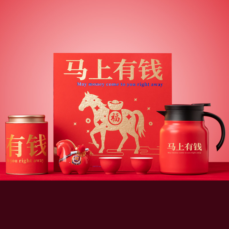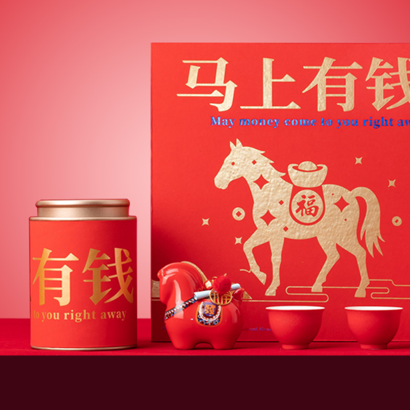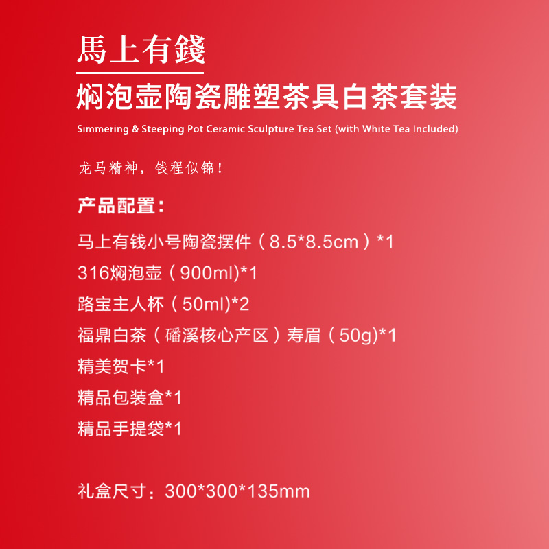 【产品配置】 马上有钱小号陶瓷摆件(8.5*8.5cm)*1 316焖泡壶(900ml)*1 路宝主人杯(50ml)*2 福鼎白茶(磻溪核心产区)寿眉(50g)*精美贺卡*1 精品包装盒*1 精品手提袋*1 【产品说明】