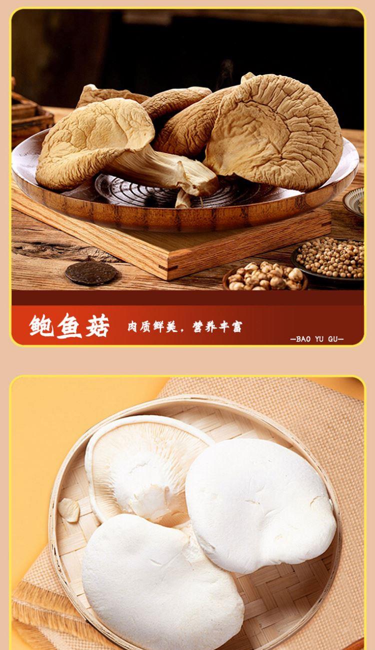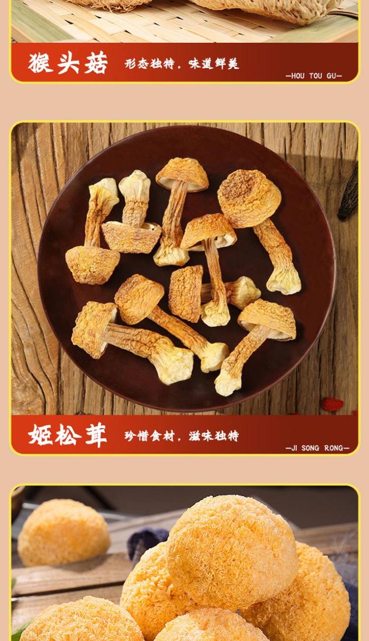 配置: 精选黑木耳100g/精选猴头菇100g/精选鲍鱼菇150g/精选杏鲍菇150g/精选香菇100g/精选桂圆250g 净重:850g 简介:山珍尊品,品质礼盒,常年品质坚守,只为美味如初。得天独厚的生长环境,深山孕育,自然采摘,采摘到成品,全程放心无污染。原生态,真滋补,无硫无添,自然晾晒,营养搭配。人工挑选,菇体肥大,肉感厚实,口感脆嫩,汤汁色泽棕黄清澈。