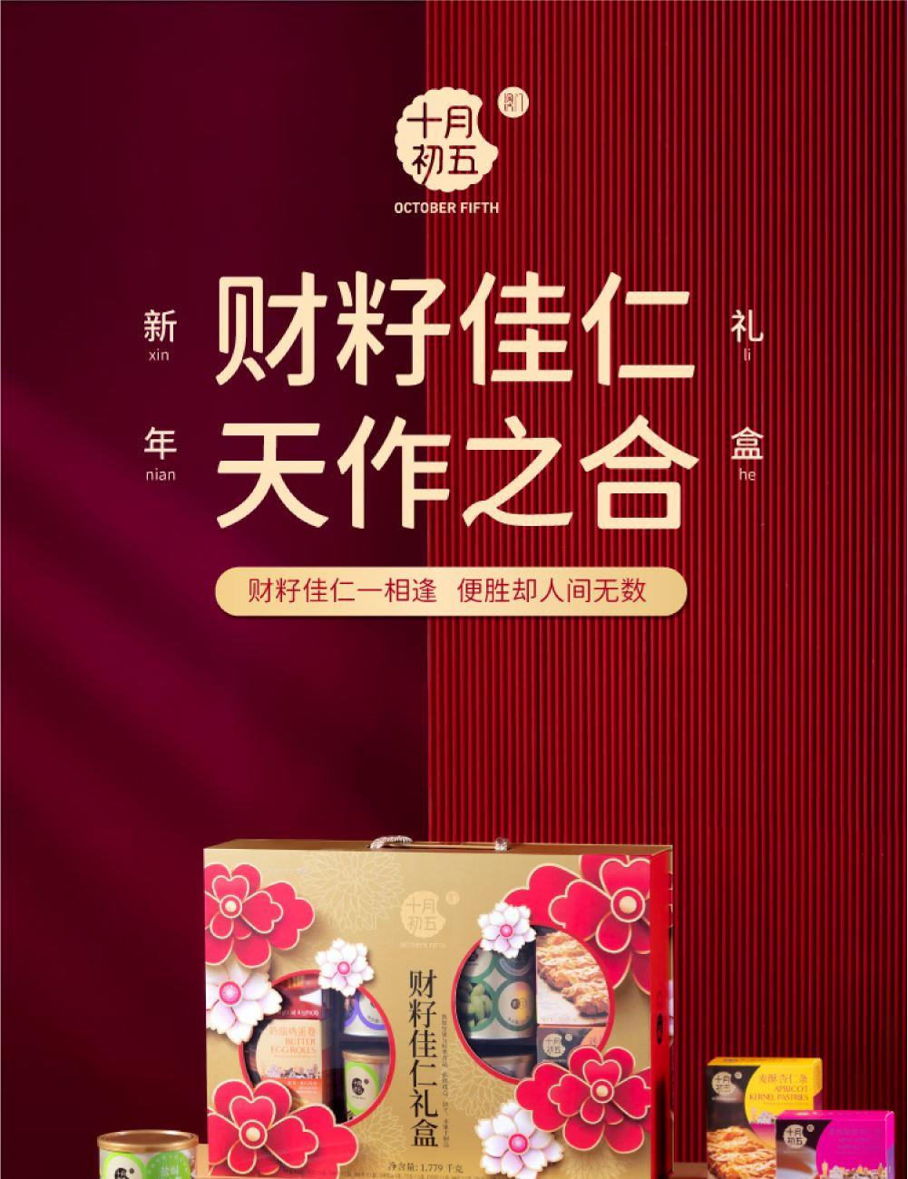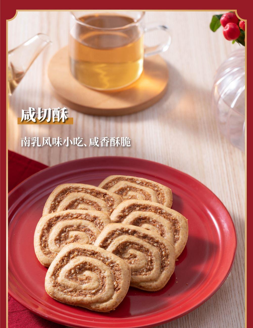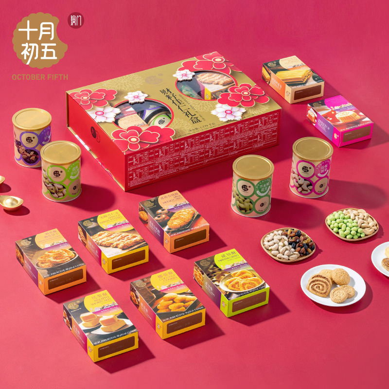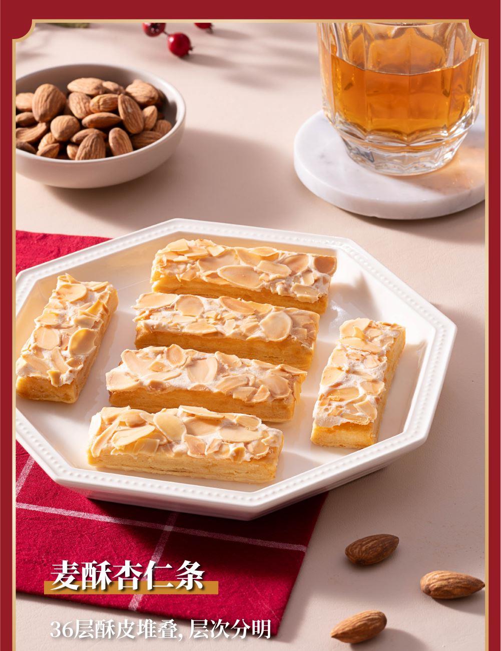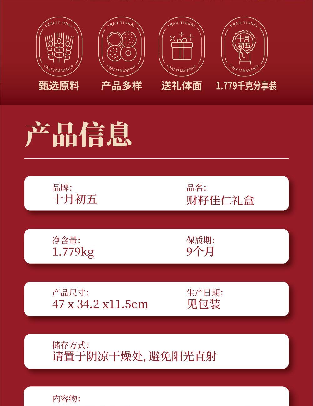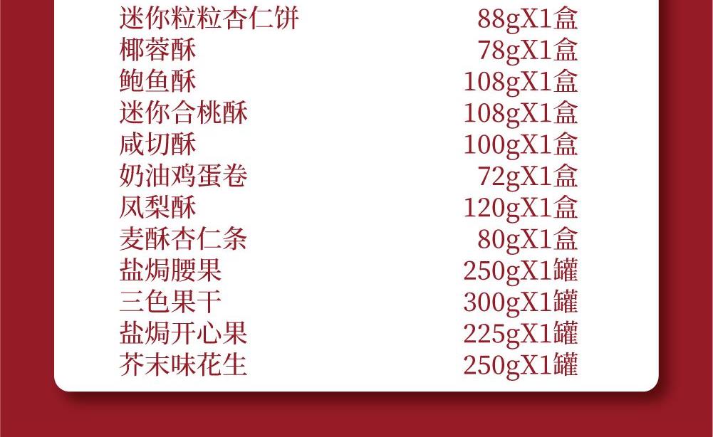 十月初五财籽佳仁礼盒 净含量:1779g 88g迷你粒粒杏仁饼X1盒 78g椰蓉酥X1盒 108g鲍鱼酥X1盒 108g迷你合桃酥X1盒 100g咸切酥X1盒 72g奶油鸡蛋卷X1盒 120g凤梨酥X1盒 80g麦酥杏仁条X1盒 250g盐焗腰果X1罐 300g三色果干X1罐 225g盐焗开心果X1罐 250g芥末味花生X1罐