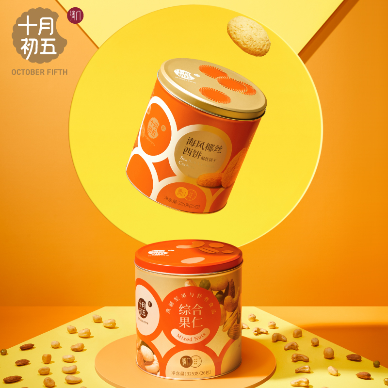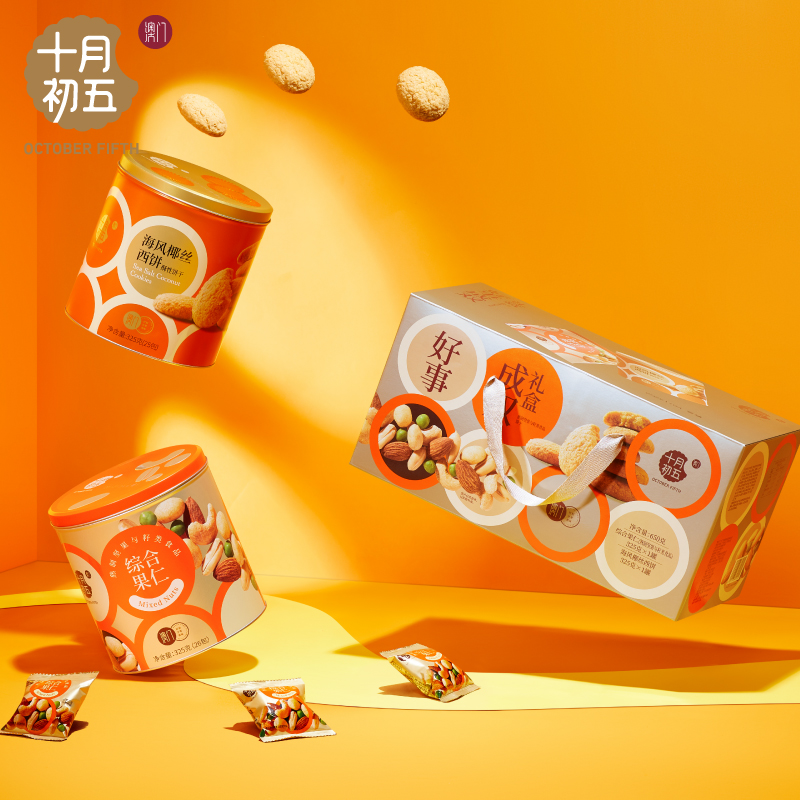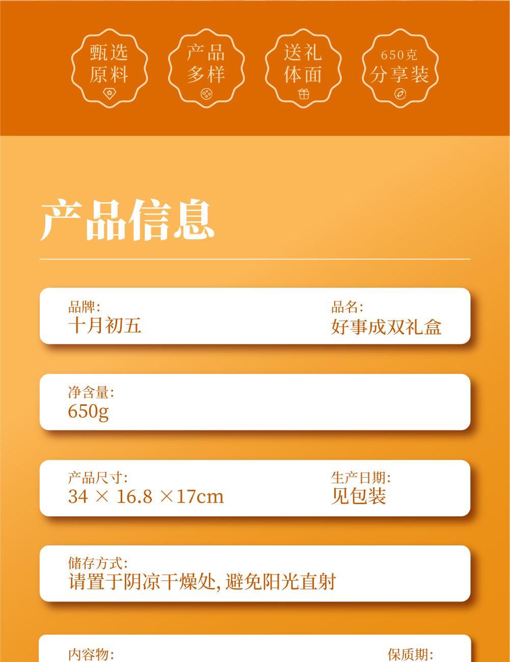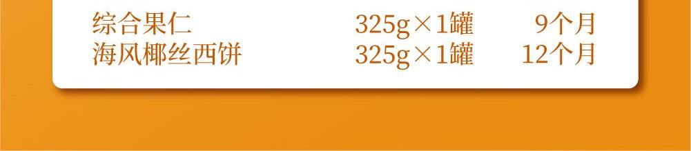 十月初五好事成双礼盒 净含量:650g 325g海风椰丝西饼(圆罐)X1罐 325g综合果仁(圆罐)X1罐